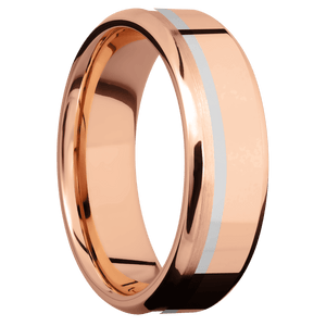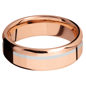 7 mm wide/Beveled/18K Rose Gold band with one 1 mm Off Center inlay of Palladium Silver also featuring a 14K Rose Gold sleeve.