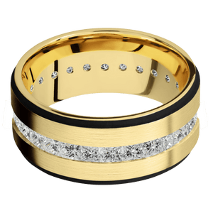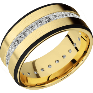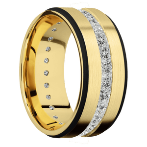 10 mm wide/Flat Grooved Edges/18K Yellow Gold band with an Eternity arrangement of .06 carat Princess Diamond stones in a Channel setting and featuring two 1 mm Edge inlays of Black