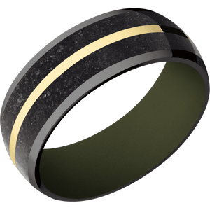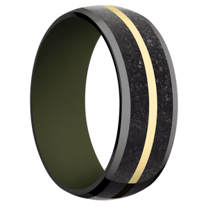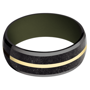 8 mm wide/Domed/Zirconium band featuring inlays of Dinosaur Bone Black and 14K Yellow Gold also featuring a Vintage Green sleeve.